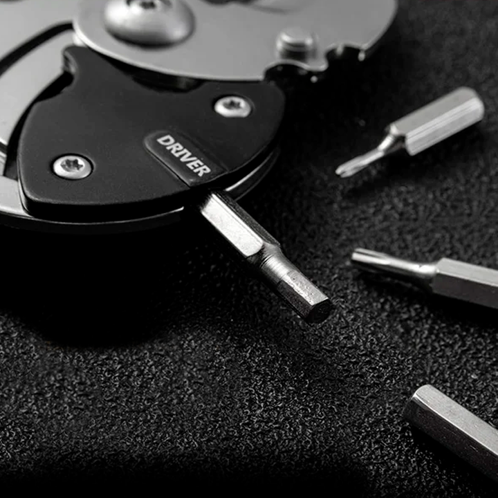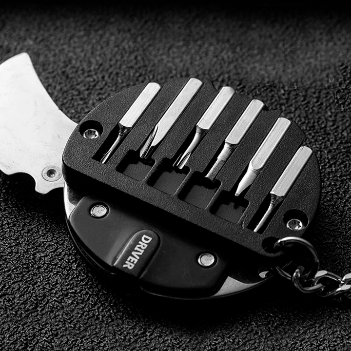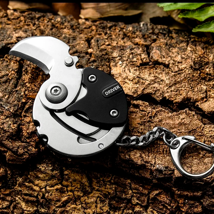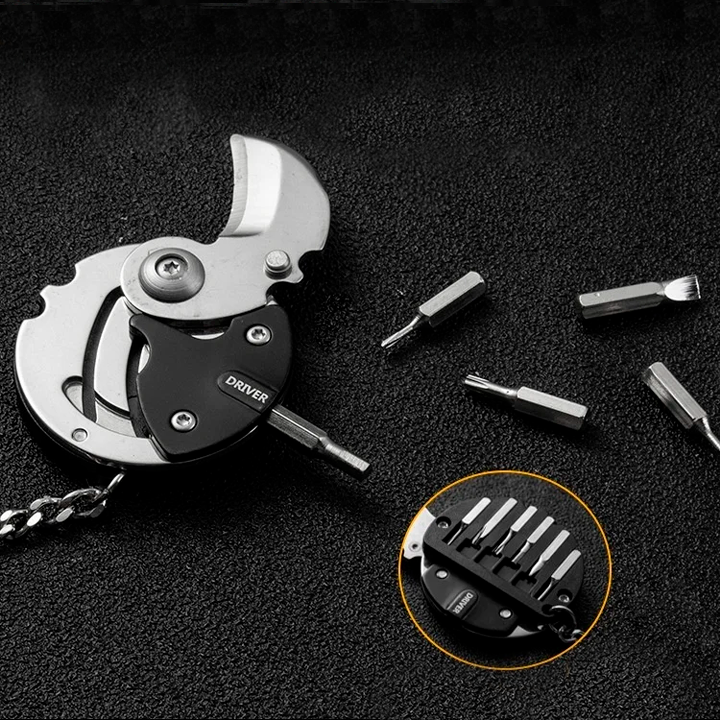 Ideal para llevarlo a diario sin ocupar espacio, reúne una cuchilla en forma de garra plegable y un sistema con 6 puntas de destornillador intercambiables que se guardan en su interior. Está fabricado con aleación metálica resistente y acabado pulido, lo que lo convierte en una herramienta de uso diario y emergencia.