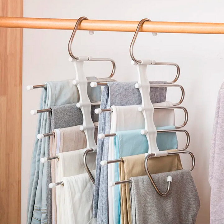 Este práctico perchero te permite colgar hasta cinco pantalones en una sola estructura compacta, maximizando el espacio en tu clóset.